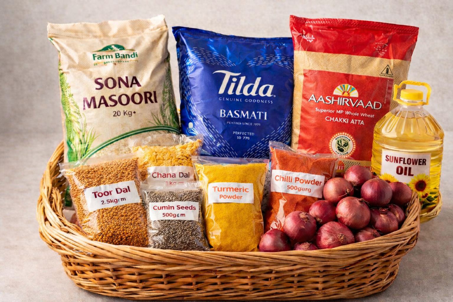 - Sona Masoori (20 Kgs) or Ponni Boiled rice (20 Kgs) or Matta Rice (20 kgs) or Basmati (10 Kgs)